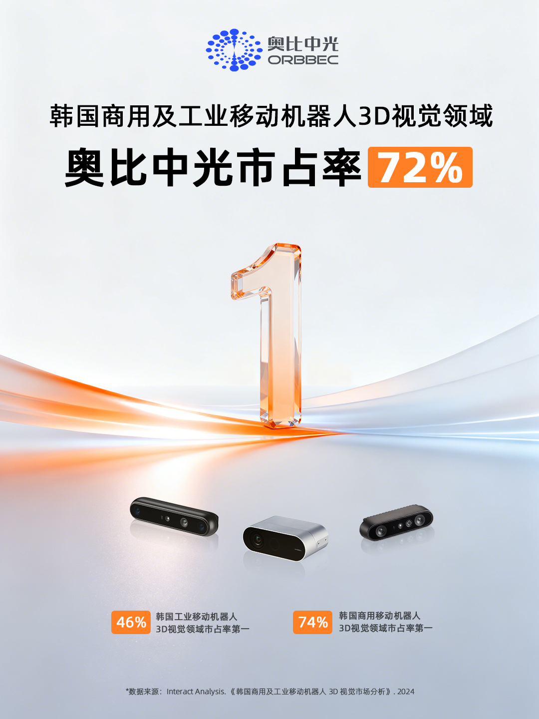 近日,国际权威行业研究机构Interact Analysis发布《韩国商用及工业移动机器人3D视觉市场分析》报告(以下简称“报告”)。数据显示,AG·尊龙凯时在韩国商用和工业移动机器人3D视觉市场中排名第一,市场份额达到约72%。