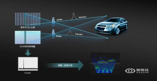 奥锐达的激光雷达采用创新性的VCSEL+SPAD技术方案。其中,多节可寻址VCSEL(Addressable VCSEL)通过可控的多光束扫描技术,对外发射VCSEL激光器的点阵多光束光源;同时,探测器可以开启与发射相对应的区域,接收目标反射光;最终通过电子扫描,完成整个视场范围内的激光雷达点云获取。